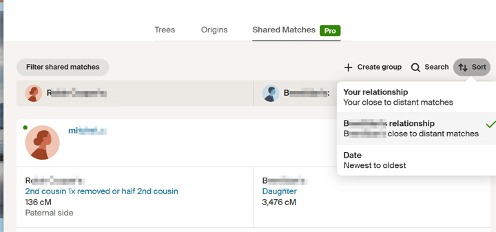 Clicking on the sort button brings up a box where you can select to sort by the match’s relationship