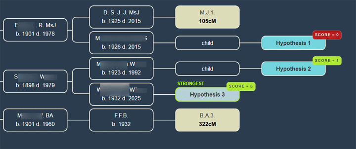 Here are a few other things I do. I put the initials of the match whose ancestor it is in the suffix field for that person in my working tree. Hints and ThruLines both seem to ignore the suffix so there are no bad side effects. Doing this makes it easy for me to retrace my steps and see the relationships. For example, Brad is the BA shown in the WATO chart above. I also put the size of the match within asterisks in the suffix of that person in our tree, so Brad got a *322*. Another tip is to keep checking the tree for duplicates, an automated way to discover where what you copied intersects with the tree you already have,